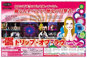 まず、通常記事ベースであるARENA Extraの紙面をビジュアルベースで展開。各公演のキービジュアルをこれまでになく大きく配置し、公演独自の世界観を表現した。特に「ラルク・アン・シエル」では文字情報を最小限に抑え、メンバーの写真をワイドにレイアウト。多くを語らずとも説得力ある構成をとった。「主なファン層を占める若い人へは、詳細よりもビジュアルで訴求しようという意図です。広告をポスター代わりに壁に張る人もいたようです」と栗田氏。進化する新聞のカラー印刷技術も後押しし、忠実な色再現ができたことも奏功した。「『トリップ・オブ・ラヴ』に関しては掲載後、チケット購買数が3倍以上伸びました。共通のロゴタイトルで、1日ではなく3日連続掲載したことの相乗効果もあるでしょう」。在京の興行関係者などからの問い合わせも後を絶たず、各方面へ予想以上の波及を見せた。