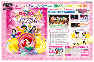 ワイドなスペースを生かした紙面構成。「何かが起こる」予感がふくらむカラーとビジュアルの訴求力。エンターテインメントの企画・プロモーションを手がけるキョードー大阪が、大阪本社版の広告特集「ARENA Extra」を用い、見開き2ページのカラー広告を4月16日から3日間にわたり連載した。紙面を飾ったのは「トリップ・オブ・ラヴ(ミュージカル)」「ラルク・アン・シエル」「ディズニー・オン・アイス」の3公演だ。