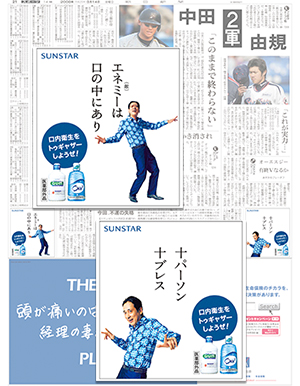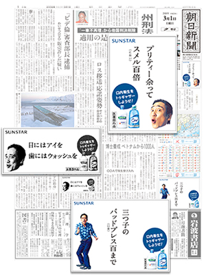 「臭(にお)わぬマウスにたたりなし」「急がばウオッシュ」など、その数51パターン。「ルー語」と格言をミックスさせた「オーラルケア格言」のコピーが連日、複数面にわたって紙面を飾った。そのインパクトに、つい視線も止まる。3月1日から2週間掲載したサンスターの小型マルチ広告だ。