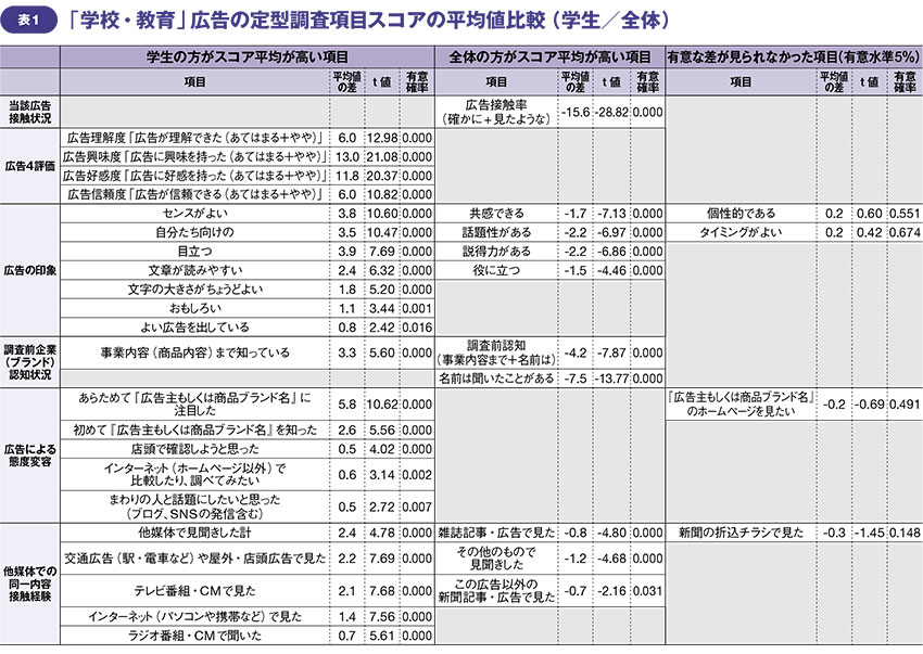 表1は、「学生(中学・高校・大学生)」ベースで算出した定型調査項目のスコア平均を「全体」ベースで算出したスコア平均と比較した表である。「平均値の差」は学生のスコア平均から全体のスコア平均を引いた値である。