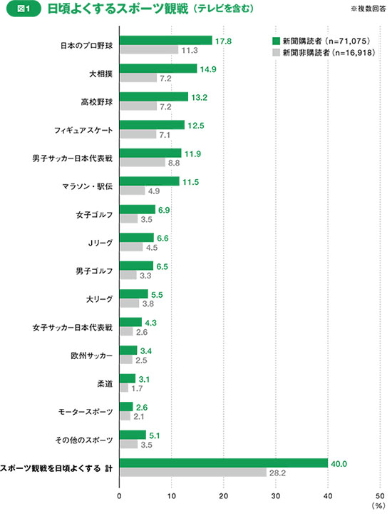 「日頃よくする」と答えた人の割合を、新聞購読者と非購読者で集計した結果が図1である。新聞購読者が日頃よくするスポーツ観戦のトップ3は「日本のプロ野球」17. 8%、「大相撲」14.9%、「高校野球」13.2%となった。これらは非購読者との差も大きい。新聞購読者と非購読者を比較すると、新聞購読者の方がすべてのジャンルでスコアが高いことが分かる。