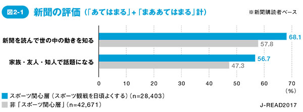 「新聞を読んで世の中の動きを知る」「家族・友人・知人で話題になる」といった新聞に対する評価が、スポーツ観戦を日頃よくする人の方がそうでない人より高い。スポーツ関心層にとって、新聞が世の中の動きを知るための重要な情報源になっており、また話題にしていることが分かる。