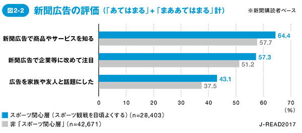 以上の結果から、スポーツ観戦という側面で見ても、新聞読者がスポーツに対して関心が高いことが分かった。また、スポーツへの関心が高い層は、新聞や新聞広告に対する評価も高く、新聞広告をよく活用している。新聞とスポーツの親和性の高さ が改めて浮き彫りになった。