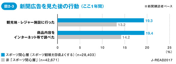 「観光地・レジャー施設に行った」「商品内容をインターネット等で調べた」といった新聞広告を見た後の行動を見てみると、スポーツ観戦を日頃よくする人の方がそうでない人よりスコアが高い。スポーツ関心層が新聞広告を活用している様子がうかがえる。