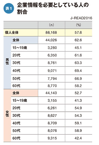 そこで本稿では、「企業情報」を必要としている人の割合を、「自分には必要ない」と答えた人の割合を除いて算出し、性・年代別に集計した(表1)。全体の6割弱が「企業情報」を必要としており、女性より男性の方が高い。特に男性の20代から50代の現役世代の「企業情報」に対するニーズが高いことが分かる。