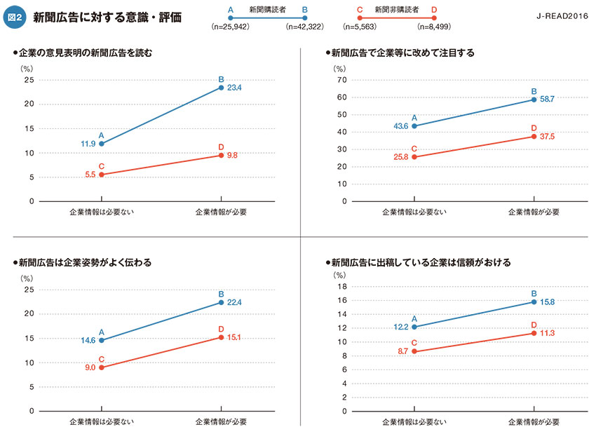 図2は、新聞購読者・非購読者について「企業情報」を必要としているかどうかで、新聞広告に対する意識や評価に違いがあるかどうかを比較したグラフである。