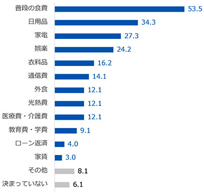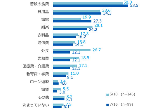 給付金を「消費・支払いに使う」と答えた人に内容を聞いた。「食費」「日用品」以外に「家電」「娯楽」に使うとの回答が多い。
