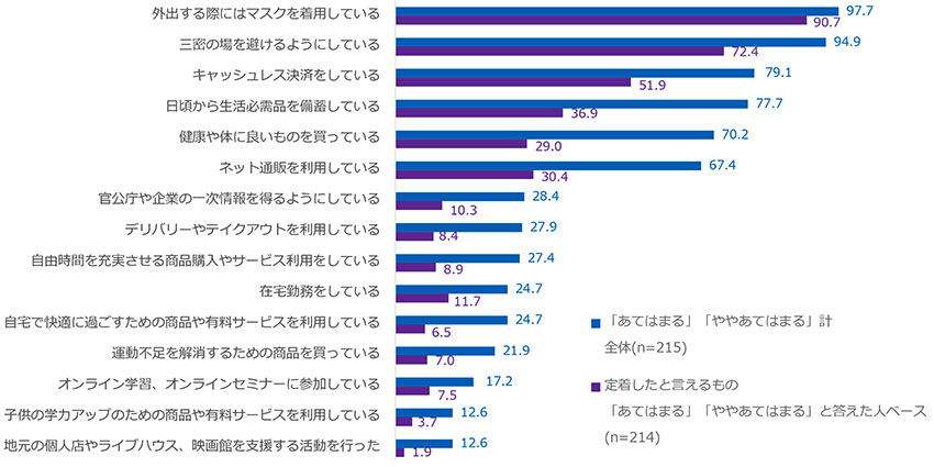 行動や生活意識で「マスクの着用」「三密回避」「キャッシュレス決済」は半数以上が定着したと回答。