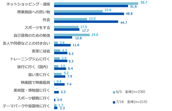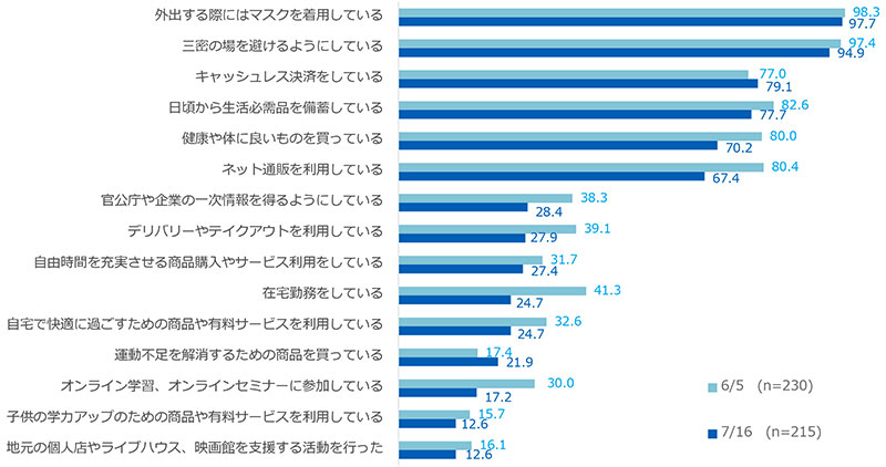 5/25に首都圏の緊急事態宣言の解除以降の行動について、参考までに6/5調査時のグラフも併記する。「商業施設への買い物」「外食」を行ったとの回答が半数近くと高い。「通販」も同じく高いが6/5調査時より微減となる。「自己啓発のための勉強」も減少している。