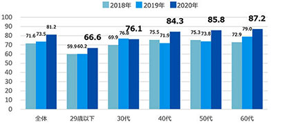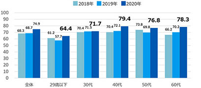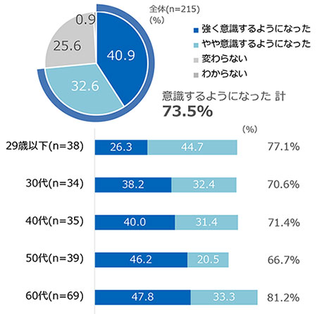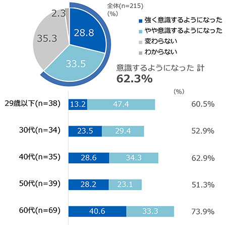 新型コロナウイルス拡大前と比べ、6割以上が「社会とのつながり」の重要性を意識するようになったと回答。全ての年代で半数以上が意識的になっている。