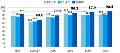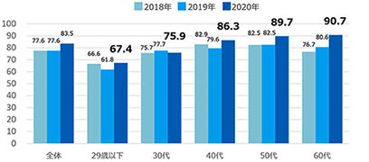 特に差が大きい4個面について、年代別でスコアを並べた。国際面の30代を除き、各年代でも2020年が最も高い接触率になっており、29歳以下の若い世代でも伸長していることが確認できる。