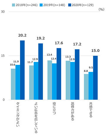 15段多色広告の接触率・広告評価は過去3年で最も高いスコアに。広告の印象では「タイミングがよい」「よい広告を出している」で特に過去同時期と2020年との差分が大きい。