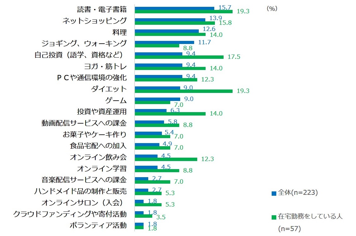 新たに始めたことは読書・電子書籍が1位。在宅勤務者ではダイエットも同率1位