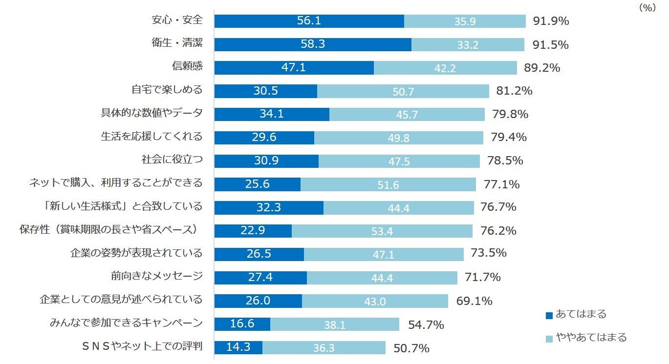 新型コロナウイルスの流行を経て、広告における「商品・サービスの情報発信」はどのような内容が表現されていると好ましいと思うか答えてもらった。「安心・安全」「信頼感」といった不安を取り除く要素、コロナウイルス対策の「衛生・清潔」の項目に約半数が「あてはまる」と回答した。「自宅で楽しめる」という安心な場所に限定した回答もスコアが高い。
