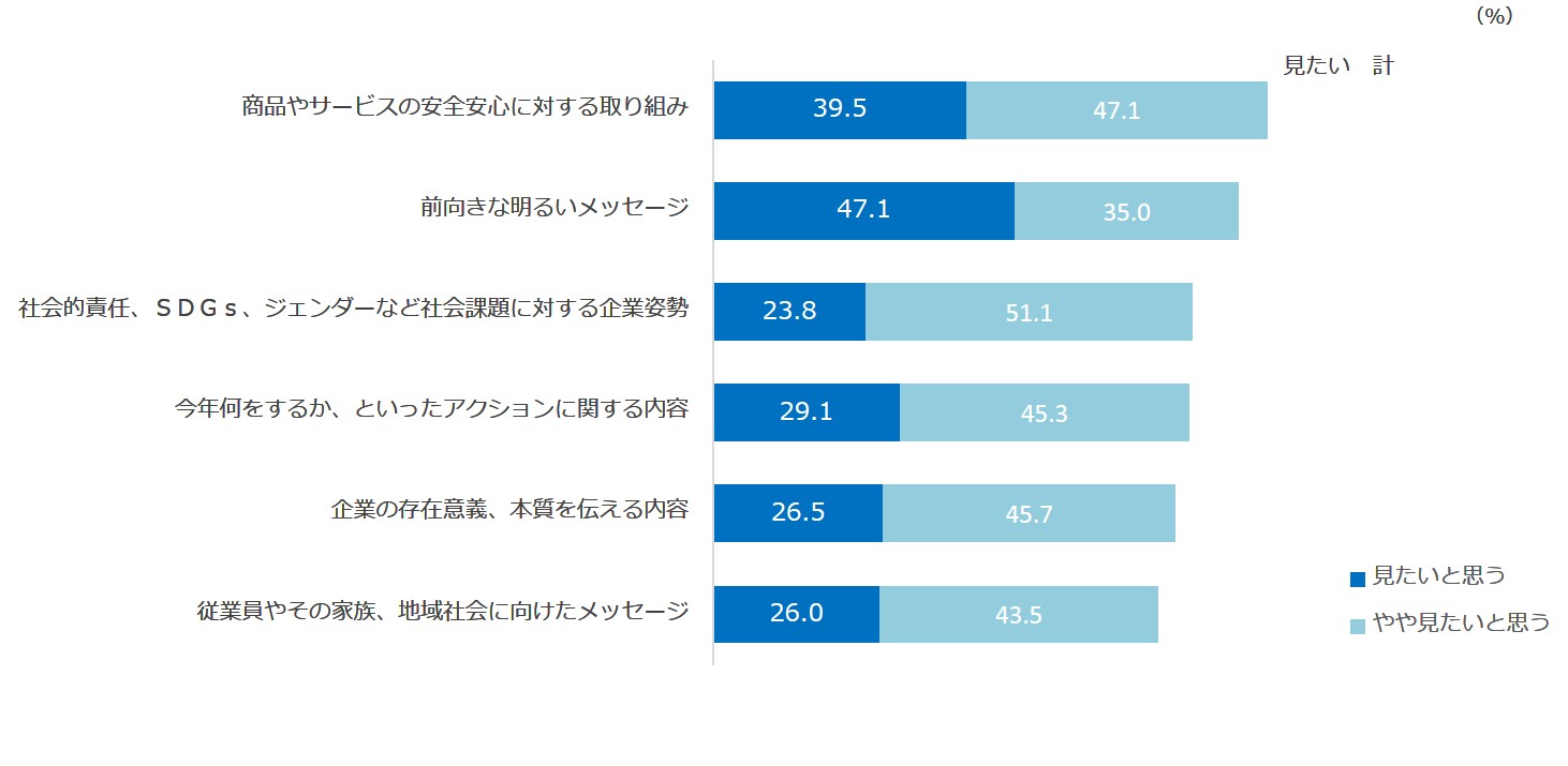新型コロナウイルスの流行を経た最初のお正月にどのような新聞広告を見たいか尋ねた。 「見たいと思う」では「前向きな明るいメッセージ」が約半数に支持され、 「やや見たい」も含めると「安心安全に対する取り組み」が上位となった。