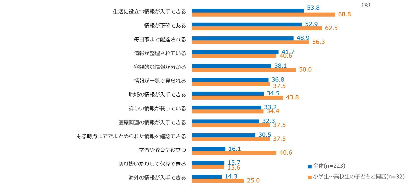 新型コロナウイルス流行以降、改めて評価することとなった新聞の機能について選んでもらった。 情報について「生活に役立つ」「正確である」「整理されている」「客観的」という順に続く。戸別宅配についてはも約半数が再評価している。小学生~高校生の子どもと同居の方では再評価が高めの傾向にある。