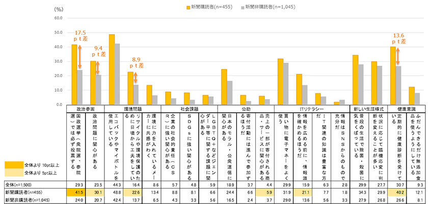 コロナ禍がもたらした新しい生活様式への対応にともない、生活者の考えや行動に多用な変化が見られた。政治への関心、環境など社会課題への向き合い方、自助と公助、デジタルや情報リテラシー、不確実な状況への対応や健康意識。今後定着してゆくであろう「ニューノーマル・コンシャス」とも言えるこういった意識や行動について、新聞購読者は非購読者より高いスコアを示している。