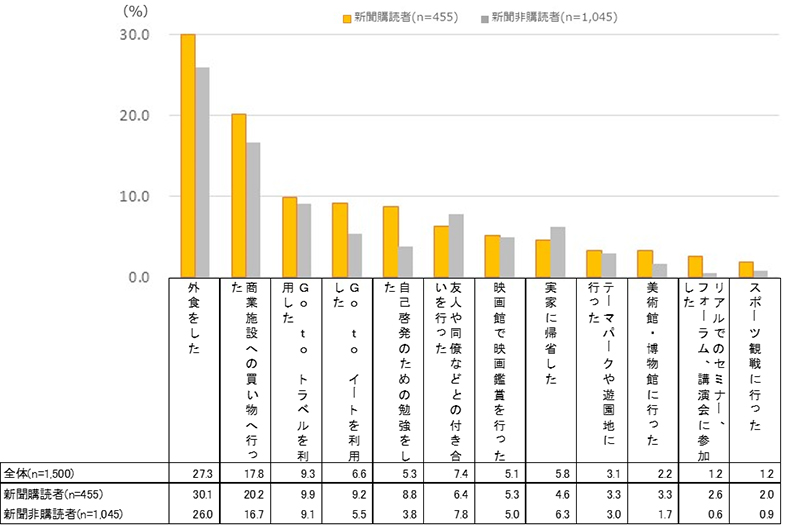 9月の4連休を含めた秋のシーズン以降に行ったことではGo To キャンペーンへの参加の回答も確認できた。新聞購読者は非購読者より外での行動がやや多い傾向が見られる。