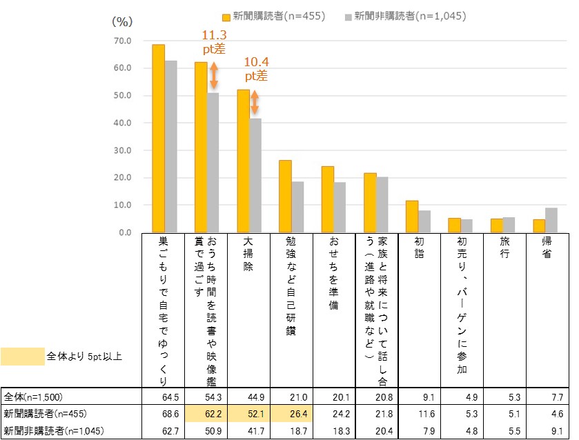 「増えそうだ」という予定の中でも「自宅での読書や映像鑑賞」「大掃除」「自己研鑽」といった項目で新聞購読者の優位性が見られる。