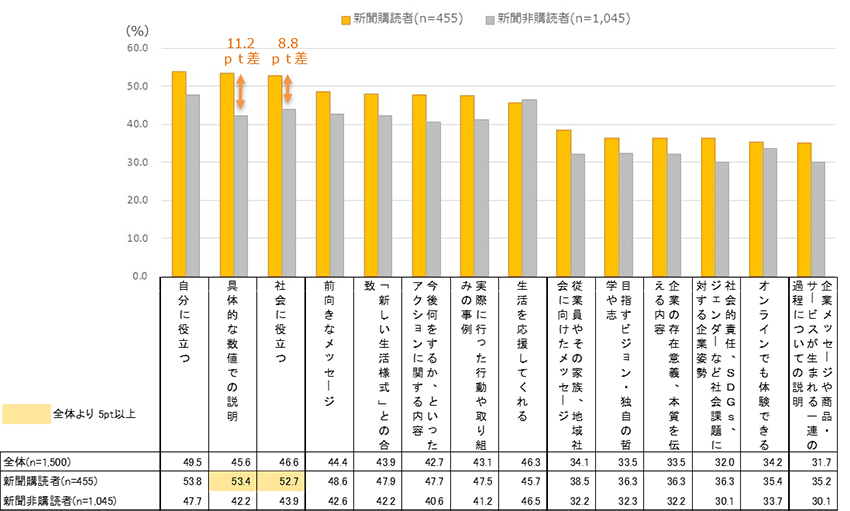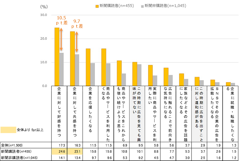 こういったコミュニケーションは新聞媒体と相性が良いこともあり、新聞購読者の「好ましい」の回答は全体よりも高い。