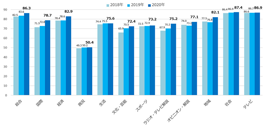 新型コロナウイルスへの対応を迫られた時期である4月~9月の定期面別調査で、各面の接触率平均値を過去3年分の同期間で比較したところ、主要な面種で2020年が最も高いスコアとなった。コロナウイルスに関連した記事が多い国際面、経済面、地域面、巣ごもり需要にニーズのあるラジオ・テレビ解説面で特に差のある結果となっている。