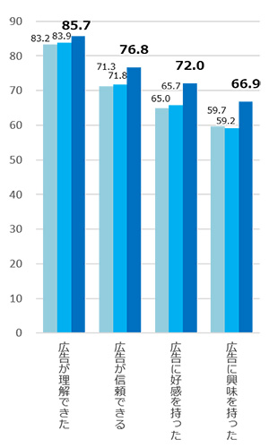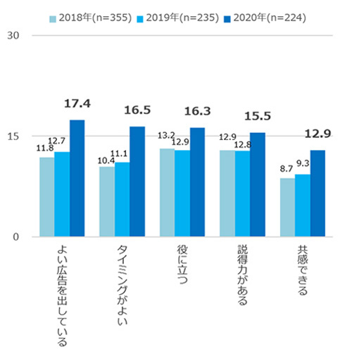 同期間に掲載された15段多色の広告定型調査の結果についても、過去3年分比較したところ、接触率、広告評価で同様に2020年が最も高い平均スコアとなった。広告の印象では「タイミングがよい」「よい広告を出している」で特に差分が目立った。