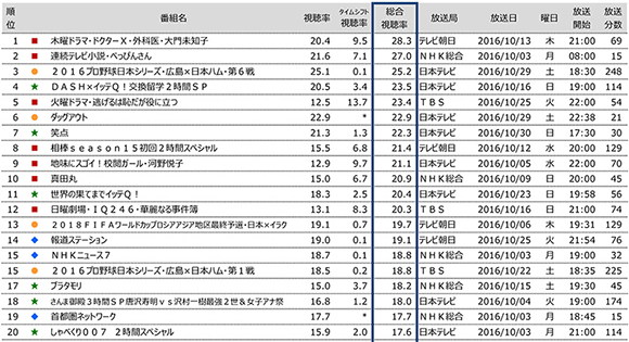 なお、3位の「2016プロ野球日本シリーズ・広島×日本ハム・第6戦」は、総合視聴率が25.2%に対してタイムシフト視聴率がわずか0.1%となっており、生で楽しみたいというスポーツ番組の特徴が反映された結果となっている。バラエティー番組も4位の「DASH×イッテQ!交換留学2時間SP」が総合視聴率23.5%に対してタイムシフト視聴率3.4%、7位の笑点が総合視聴率22.3%に対してタイムシフト視聴率が1.3%とリアルタイム視聴率が高い。