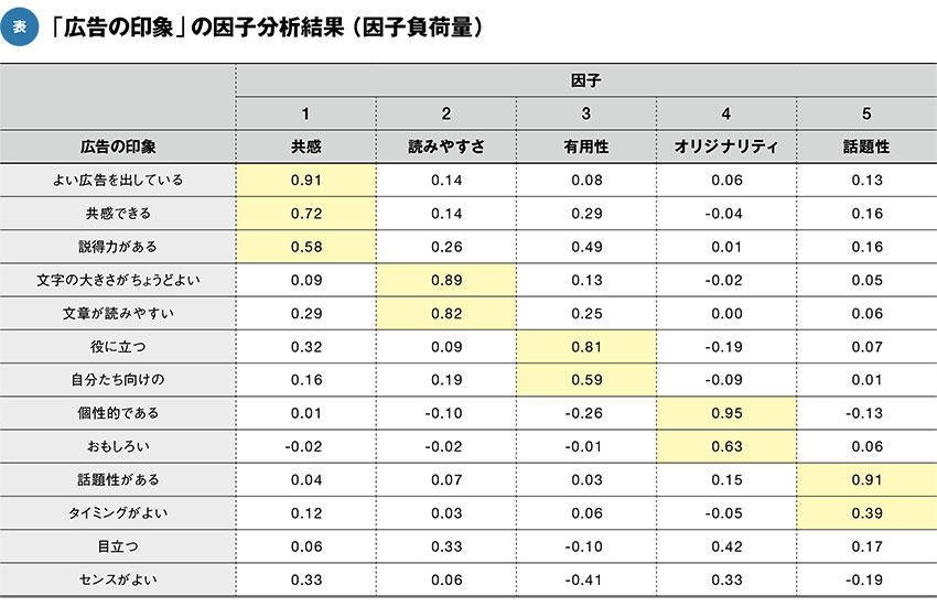 5因子の名前は、因子負荷量の大小によって解釈し命名したものである。第1因子「共感」は「よい広告を出している」「共感できる」「説得力がある」の負荷量が大きいので、「共感」因子と名付けた。以下「読みやすさ」「有用性」「オリジナリティ」「話題性」因子と名付けた。