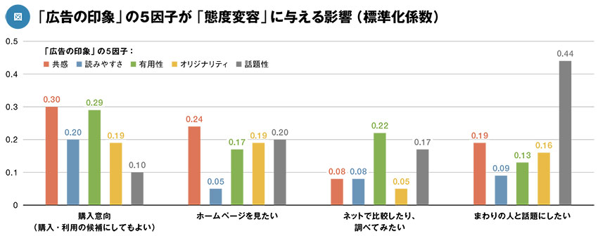 この5因子を説明変数として、「購入意向」など態度変容との関係を重回帰分析という統計的手法を使って分析し、標準化係数を比較したのが図である。標準化係数が大きい因子ほど、それぞれの「態度変容」に対する影響力が大きいことを表している。
