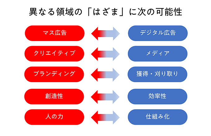 そこで、私が今、取り組んでいるのが、認知から購買までの断絶を解消し、アッパーからロウワーファネル全体を接続・統合すること。それによって、創造と効率の両立を目指しています。これまで相入れることが難しかった異なる領域の間には「はざま」があり、それをミドルファネルで埋めていこうという考えです。