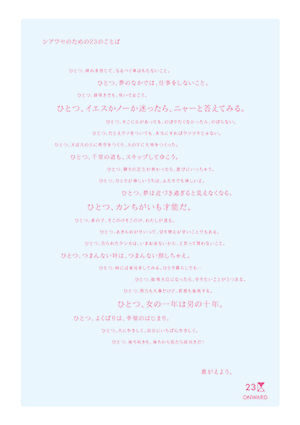 たとえば、コンセプトの立て方が違います。最初のキャンペーンは「月9」をコンセプトにして、ドラマ中の名ゼリフをイメージしたコピーで展開しました。しかも、23区にちなんでTVCMも、グラフィックも、ウェブ動画も、全て23本ずつ作り、それぞれコピーを変えました。おそらく3,000本くらいコピーを書いたと思います。他にも23区では、「シアワセのための23のことば」と題して、女性の心得のような広告も制作しました。その広告に目をとめてくださった出版社の方に声をかけていただいて、写真家の平林美紀さんが撮影した羊の写真に言葉を合わせる『マイペースのススメェー』の文を担当しました。とても光栄な機会でした!