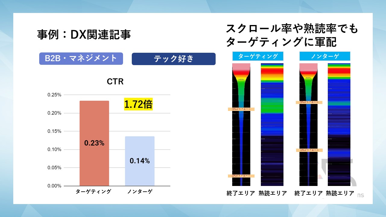 田中 環境関連イベントの集客、DXに関連した記事などでPOCを実施しました。数値的なところでいくとCTRが1.2倍から1.5倍くらいになるものがあったりして、非常に上がったという実感があります。フォームがあるものは、フォームへの遷移率が2倍強になるものもあったので、意味があったと考えられると思います。スクロール率も上がっていたので、主要な数値に関しては上がったという感じです。まだまだ分からないところもありますが、「もしかすると大きな塊の記事より、小さなインプレッションの記事に意味があるのかも」など、少し光が見えたような印象です。